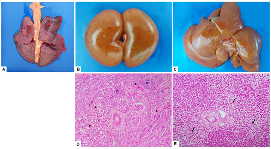 Common gross and histopathological findings of the infected dog. Necropsy findings included generalized icterus, petechial to ecchymotic hemorrhages in the lungs (A), kidneys (B), and liver (C). For histopathological analysis tissues were stained with hematoxylin and eosin (HE). Note, kidneys showing interstitial nephritis with multifocal lymphohistiocytic (asterisk) with diffuse tubular degeneration (arrowhead) (D), and liver with massive dystrabeculaton (loss of cohesion) of hepatocytes with degeneration areas, and necrosis (arrows) (E). The histopathology photomicrographs were taken at a magnification of ×10.