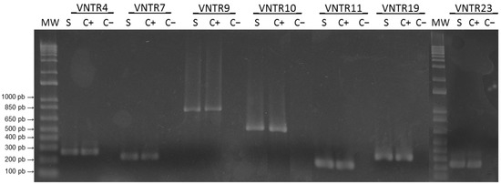 PCR analysis of the polymorphism of seven representative VNTR loci. MW: Molecular weight marker (1 Kb plus DNA ladder). (S) Sample from genomic DNA from Leptospira isolate (named NEG7); (C+) positive control (genomic DNA of L. interrogans serovar Copenhageni strain Fiocruz L1-130) and (C−) negative control (water template).