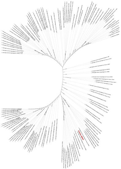 For phylogenetic analysis, the 17 available strains of the pathogenic Leptospira spp. (P1) described by Vincent et al. (2019) [37], 114 L. interrogans serovar Copenhageni strains, and 13 L. interrogans serovar Icterohaemorrhagiae strains isolated from infected humans and animals were used (the complete list is presented in Supplementary data; Table S1). All strains are available at the NCBI RefSeq. The analysis was based on Leptospira spp. core genes derived from PubMLST, and the results revealed the diversity of the Copenhageni strains. Isolate NEG7 was clustered into a distinct subclade containing only Copenhageni strains, showing close genetic relatedness (Figure 3). Icterohaemorrhagiae strains were dispersed within all subclades, but in most of them, they formed a distinct branch.