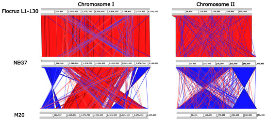 A structural comparison was performed using ACT based on the L. interrogans serovar Copenhageni strain Fiocruz L1-130 (virulent) and L. interrogans serovar Copenhageni strain M20 reference genomes (Figure 4). All contigs were mapped to the two chromosomes, and no extrachromosomal elements were identified (e.g., phages and plasmids). Structural analysis facilitated the identification of some arrangement variations (blocks of inverted sequences between the genomes and translocations) in the respective chromosomes, with the NEG7 isolate showing a genomic structure similar to the virulent L1-130 strain. When the NEG7 genome was compared to the M20 strain, a large number of genomic inversions and translocations were observed between the pairs of genomes.