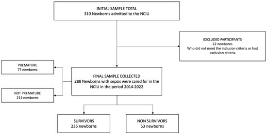 A total of 310 neonates were enrolled, of which 22 were excluded (due to lack of data in the medical records). A total of 288 neonates with sepsis were analyzed; the flow diagram of the study population is shown in Figure 1.