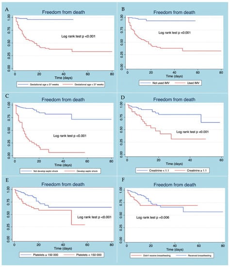 Kaplan–Meier survival curves according to gestational age (A), use of VMI (B), developed septic shock (C), creatinine level (D), platelet level (E), and received breastfeeding (F).