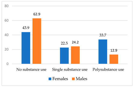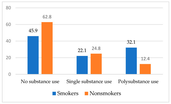 In the full sample, overall substance use was moderately high. Approximately half (44.5%) of participants reported any current use of at least one of the substances assessed (i.e., alcohol, cannabis, heroin, cocaine, methamphetamine, heroin, and hallucinogens). Approximately one-third (32.2%) reported current alcohol use, 26.1% reported current cannabis use, and 9.2% reported current cocaine use (data not shown). Across smoking status and gender, there were no differences in single substance use. Approximately one in five participants (21.4%) reported polysubstance use. Crude associations demonstrate that polysubstance use was more prevalent among those with current smoking relative to those without current smoking (OR = 1.99; 95% CI, 1.17–3.38) and among females relative to their male counterparts (OR = 2.17; 95% CI, 1.27–3.69), respectively (see Figure 1 and Figure 2).