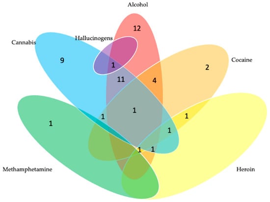 Figure 3 and Figure 4 illustrate the types and patterns of substance use among ART adherent and ART non-adherent study participants. Among the adherent group (Figure 3), 29 were single substance users (18 reported alcohol use, 10 reported cannabis use, and 1 reported cocaine use). In addition, 27 were polysubstance users (the most common combination was 17 individuals who reported alcohol and cannabis use). Among the non-adherent group (Figure 4), 24 reported single substance use (12 reported alcohol use, 9 reported cannabis use, 2 reported cocaine use, and 1 reported methamphetamine use). In addition, 22 reported polysubstance use (the most common combination was 11 individuals who reported alcohol and cannabis use).