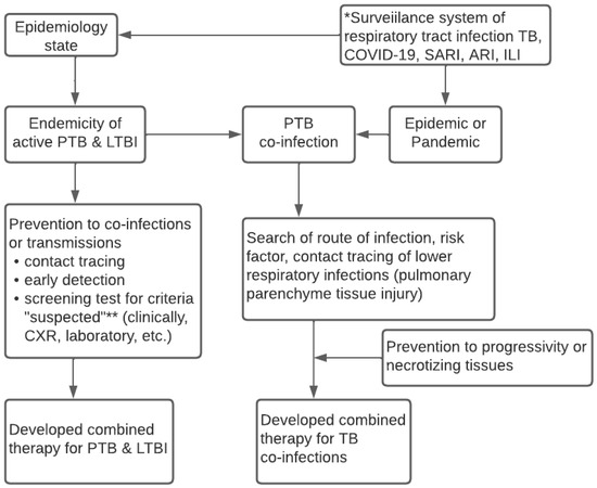 The right timing of diagnosis is an essential factor for aligning the integration of the management of both diseases. Due to the early symptoms and acute onset of SARS-CoV-2 infection, quick detection will help early diagnosis and follow with a rapid examination of Mycobacterium tuberculosis infection, discovery, and radiological examinations [55]. Previous reports stated that TB has a natural effect or “weight” in increasing the probability of death among COVID-19 patients. Therefore, patient management in health services and the pathogenesis of TB and COVID-19 can be analyzed based on references to case reports to determine the basic management strategies. This also involves respiratory infections, starting from the primary or priority prevention of disease progression and the prevention of illness or spread of disease to further treat TB-COVID-19 cases in the form of a standard algorithm [28,56].