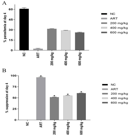 Effect of ethanolic extract of G. malaccensis (200, 400, and 600 mg/kg body weight) on the percent parasitemia (A) and percent suppression (B) in Plasmodium berghei-infected mice in the 4-day suppressive test compared to the negative control (NC) and positive control (artesunate; ART). Data are expressed as mean ± SEM (n = 5 per group), * Compared to negative control, p < 0.05.
