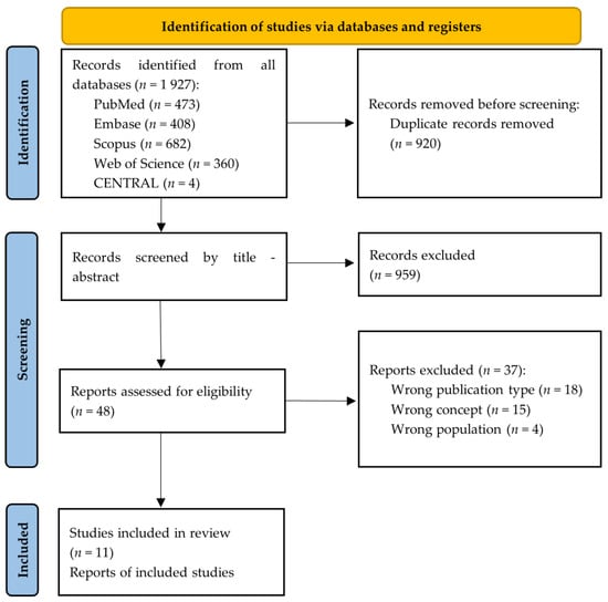 A total of 1927 articles were retrieved using the search strategy. The selection strategy is shown in the prism flow chart (Preferred Reporting Items for Systematic and Meta-Analysis Extension for Scoping Reviews). After the removal of duplicates (n = 920), 1007 articles were screened by the reviewers. After filtering the titles and reading the abstracts, 48 articles were selected for full-text reading, and 11 were considered eligible for inclusion in this Scoping Review (Figure 1) [1,18,19,20,21,22,23,24,25,26,27].