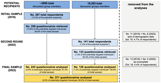 As shown in Figure 1, in 2019, a total of 243 participants were recruited (i.e., 2.9% of potentially targeted OP from the parent discussion group and 91.0% of the initial sample of 267 retrieved questionnaires). On the contrary, in 2022, a total of 141 respondents participated in the survey (1.4% of potential recipients), and 128 questionnaires were ultimately included in the analyses (1.2% of potentially targeted individuals and 90.8% of the initial sample).
