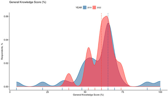 General Knowledge Score (GKS) on Travelers’ Diarrhea in 371 Italian occupational physicians participating in the survey, broken down by year of recruitment (i.e., 2019 vs. 2022). GKS was substantially skewed (D’Agostino–Pearson’s normality test K2 = 151.6, p-value < 0.001). Dotted lines represent median value.