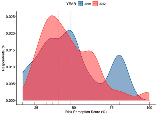 Corresponding RPS was estimated to be 47.1% ± 19.5 (actual range: from 16.0% to 100%). As shown in Figure 3, the score was substantially skewed (D’Agostino–Pearson’s normality test K2 = 21.9, p-value < 0.001), with no substantial differences between estimates for 2022 (46.5% ± 18.0) and 2019 (47.4% ± 20.4, p = 0.724).
