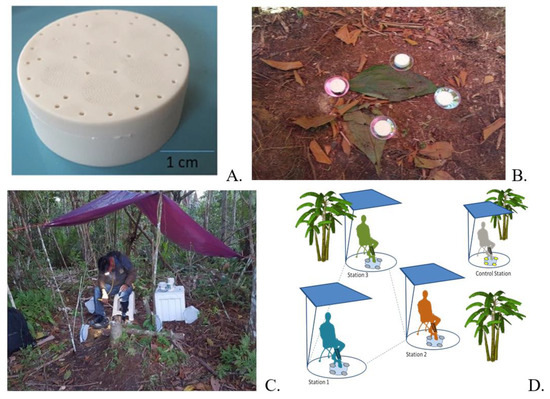 Mosquitoes were collected using approved protected human landing collections (HLCs) with experienced collectors exposing one stocking-covered leg and using mouth aspirators to collect all mosquitoes that landed within a 6 h sampling period (1800–2400 h), as shown in Figure 1. All collectors were on a physician-prescribed regimen of malaria chemoprophylaxis to prevent malaria infections and wearing protective clothing (Mosquito jacket, long sleeve shirts, long pants). Collections were conducted at the start of each hour for 30 min with a 30 min break. Samples for each site, hour, and treatment were collected in individual cups. Figure 1A shows an image of a CRD. Figure 1B shows the arrangement of 4 CRDs for each location. Figure 1C shows a protected HLC station, showing one collector. Figure 1D shows the layout of the four stations. Three collection sites were used for active devices, and an additional collection site was used for control. Each collector was rotated at the end of each sampling period. The sites were approximately 30 m apart. Collectors were rotated using a randomized block design experiment (M = 3) to reduce bias from one another, for a total of seven rotations (R = 7). The total number of active samples were 21 (N = 21), and the total number of control samples were 6 (N = 6). CRDs were designed for a sustained release of at least one week. To avoid any initial transient response that can lead to performance variability, HLCs were measured six hours after device activation to obtain uniform performance across devices under steady-state conditions [18,19,20].