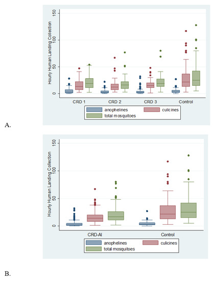 Figure 2. Plots of hourly catches of anophelines, culicines, and total mosquitoes recorded. (A) Control and individual CRDs (CRD 1, CRD 2, CRD 3). (B) Control CRD versus the mean of number of mosquitoes collected in CRDs with metofluthrin (CRD-AI). Mosquito species were collected using protected human landing collections in Mapacocha, Loreto, Peru, between 10 and 26 January 2017.