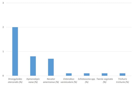 - Harhay, M.O.; Horton, J.; Olliaro, P.L. Epidemiology and control of human gastrointestinal parasites in children. Expert Rev. Anti. Infect. Ther. 2010, 8, 219–234. [Google Scholar] [CrossRef]