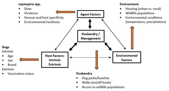 One of the basic models of causation of infectious disease is the epidemiologic triad. The epidemiologic triad consists of three main parts–the pathogen or infectious agent, the susceptible host (i.e., dogs in this review), and the environment which bring host and agent together. It is also a model that allows for evaluation of the interactions between the factors that drive the spread of an infectious disease. Figure 1 illustrates an epidemiologic triad for canine leptospirosis (Figure 1).