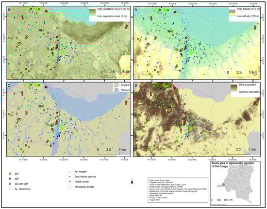 Ecological data: With the collaboration of the Central African Satellite Forest Observatory (OSFAC), Kinshasa, the geospatial maps were performed using ArGis 10.8 (https://www.esri.com/, accessed on 12 September 2022). Three environmental parameters, including the vegetation cover, humidity (proximity to water bodies), and altitude of the municipalities, were used to discriminate the different ecological classes that can have a negative or positive impact on the presence of mosquitoes and dengue exposure. The three parameters varied as follows: (i) Vegetation cover varied between zero soil (0%) and area covered by vegetation (100%), (ii) the elevation varied from 178 to 817 m, (iii) the data on Kinshasa water bodies helped to identify humid areas, and (iv) the demography varied by population density. The data came from field collection, and the geographical coordinates of positive grid cells to Ae. aegypti and Ae. albopictus together with those of the positive cases of dengue exposure were associated with different ecological parameters to produce maps (Figure 2).