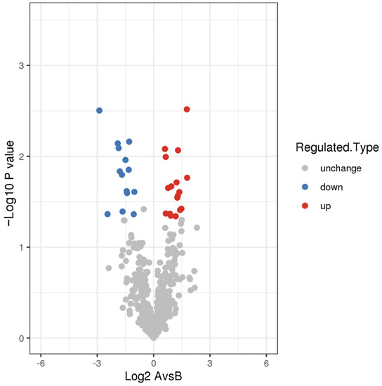 Volcano plot of DEPs. The blue dots represent proteins that are up-regulated (infection group vs. healthy group). The red dots represent down-regulated proteins (infection group vs. healthy group).