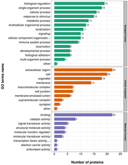 The gene ontology annotation (GOA) (https://www.ebi.ac.uk/GOA/index, accessed on 26 January 2021) program aims to provide annotations to protein databases in UniProt. Initially, the identified protein is converted into UniProt ID, followed by mapping to GO IDs. In the case of an unannotated protein ID, the InterProScan program was used to annotate the protein based on the protein function that was hypothesized by the sequence alignment approach. Then, according to GOA, these proteins are divided into three groups: cell component, biological process, and molecular function. A Fisher’s exact test (two-tailed) was implemented to examine the enrichment of the proteins in comparison to the identified proteins, and p < 0.05 was judged as significant.