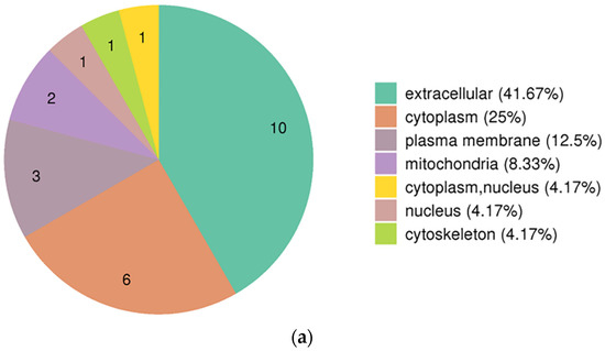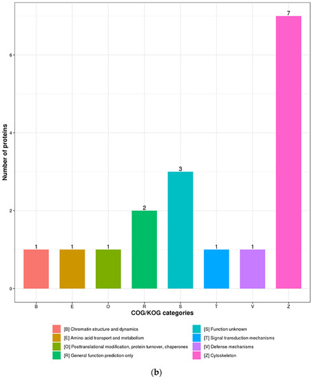 Subcellular localization and COG/KOG functional classification of the 24 DEPs. (a) Subcellular localization analysis of the 24 DEPs. (b) COG/KOG analysis of the 24 DEPs. Clusters of orthologous groups of proteins are named COG/KOG. The proteins that make up each COG/KOG are assumed to be derived from an ancestral protein. Therefore, the proteins in the same COG/KOG are considered orthologs or paralogs. Orthologs refer to proteins from different species that have evolved from vertical families (species formation), and characteristically preserve the same function as the original protein.