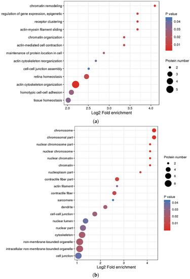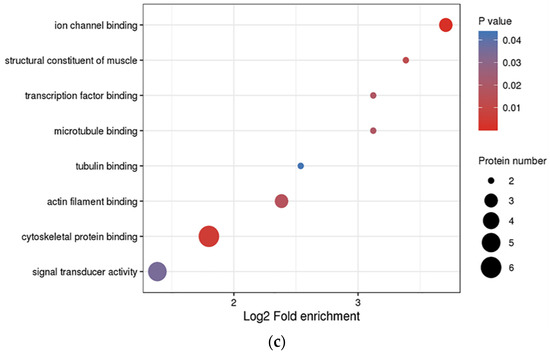 GO enrichment shown in the bubble plot of 24 DEPs in three categories: (a) biological process; (b) cellular component; (c) molecular function. For the enrichment test (Fisher’s exact test was used here), resuls show the most significant top 20 classifications. The y-axis denotes function classification, and the x-axis denotes the log2 converted value of the fold change. The significance of enrichment p-values is represented by colors. The circle size signifies the number of DEPs in each functional class or pathway.