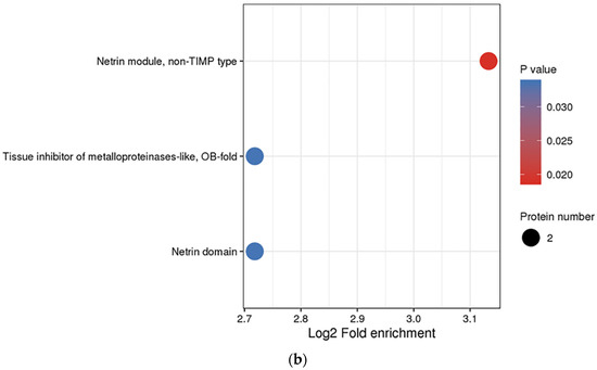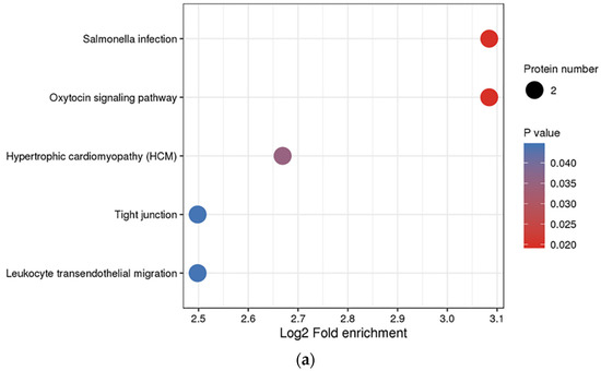 With an aim to determine the function of DEPs, we performed the GO, KEGG, and protein domain enrichment analyses. Figure 4 demonstrates the results of the GO enrichment analysis on the 24 DEPs. In regard to biological processes, 13 GO terms were allotted. Among these terms, actin cytoskeleton organization (GO: 0030036), chromatin remodeling (GO: 0006338), and receptor clustering (GO: 0043113) were the first three significantly enriched terms. In regards to the cellular component, eight GO terms were assigned. Among these terms, the chromosomal part (GO: 0044427) and chromosome (GO: 0005694) were the most significantly enriched terms. In regard to the molecular function, eight GO terms were assigned; ion channel binding (GO: 0044325) was the most significantly over-represented term (Supplementary Table S5). Several biological functions were identified by incorporating various genes in vivo. The cellular signaling pathway enrichment analysis provided insight into the involvement of differentially expressed genes in signal transduction and biochemical pathways. Figure 5a (and Supplementary Table S6) demonstrated the involvement of five pathways with 24 significantly and differentially expressed proteins. It displayed that the oxytocin signaling pathway was the most enriched term. Two DEPs identified in our study seemed to be the participants in this pathway. Moreover, it is worth noting that the leukocyte transendothelial migration was also found to be significantly enriched. Furthermore, the protein domain enrichment analysis indicated that the netrin module (non-TIMP type) was the most enriched in the DEPs (Figure 5b and Supplementary Table S7). Notably, the immunoglobulin subtype was the most enriched in the DEPs that were down-regulated.