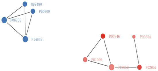PPI network for DEPs interactions with three genes is extracted through STRING databse confidence cutoff of 0.900 (https://string-db.org/, accessed on 26 January 2021). The interaction network is reconstructed by using the Cytoscape software. The circles represent the differentially expressed proteins. Different colors represent the DEPs (blue is the down-regulated protein and red is the up-regulated protein). The size of the circle suggests the number of DEPs and their interacting proteins. In this study, we screened the top 50 proteins with the closest interaction and mapped the protein interaction network.