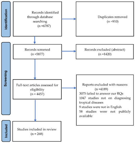 Following the initial search and analysis for the exclusion of unrelated studies along with the inclusion of additional articles, the pool of selected articles became 268. Based on our exclusion criteria, 6787 papers were excluded, of which 1420 were conference abstracts, 910 were duplicates, 3075 studies failed to answer our RQs, 1047 of the papers’ focus were not on diagnosing tropical diseases, nine were not written in English, and 58 were not publicly available to download. The final pool of studies chosen has also been published in our online repository. Table 3 shows the number of papers in the collection by their year of publication.