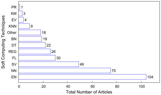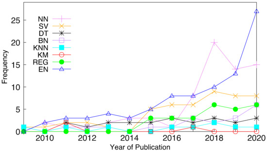 This section summarizes the soft computing techniques covered in the studies, which were classified into 12 categories (Figure 2): Ensemble (EN), Regression (REG), Support Vector Machine and Support Vector Regression (SV), Fuzzy Logic (FL), Decision Tree (DT), Neural Network (NN), Evolutionary models (EV), Bayesian (BN), K-nearest Neighbors (KNN), K-means (KM), Probabilistic Reasoning (PR), and Other. The techniques that were categorized as ‘Other’ did not specify an exact algorithm used in the article. The various categories of techniques in the studies and their respective frequencies are illustrated in Figure 3. The highest percentage of the articles in this work used ensemble techniques for classification, prediction, analysis, diagnosis, etc. This is due to the robustness of ensemble techniques and their ability to achieve much better performance than a particular soft computing technique. The NN was the second highest due to its ability to identify hidden patterns, learn unceasingly, and enhance its capability in the process. Support Vector machine was the third highest, followed by fuzzy logic, regression techniques, decision tree, etc. The central thought about ensemble approaches is that a collection of algorithms will produce a more robust model [5]. Comparative analyses show that ensemble models outperform individual machine-learning algorithms [51,52]. Clinical investigators employ NN models in diagnosing and predicting clinical outcomes because of their suitability in modeling relationships between variables [53]. NNs have proven their potential in classification tasks, especially with the best results on various image classification tasks. SVM is best appropriate for labeled datasets and is one of the powerful algorithms widely utilized for regression and classification analysis [54]. We conducted further analysis of the soft-computing techniques in terms of the frequency of algorithms used, the goal of the study—prediction, classification, analysis or evaluation, and usage trend over the period under consideration.