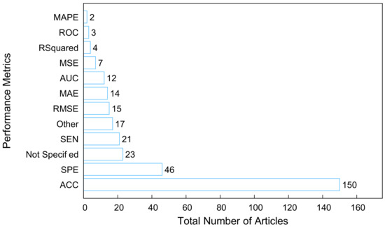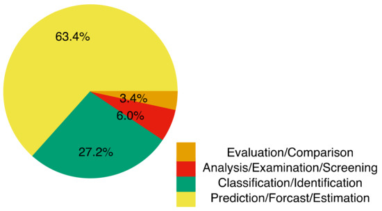 Figure 3 shows the goals of the algorithms used in the study, such as prediction, classification, analysis, and evaluation as well as their respective frequencies. Of the algorithms used in the study, 63.4% handled prediction, forecasting, and prognosis (categorized into one group); this category focused on the prognosis and prediction of diseases such as malaria, typhoid, dengue fever, and other tropical diseases [55,56,57]. The second category (27.2%) grouped articles with algorithm goals like identification and classification of dengue fever and other tropical diseases [58,59,60]. The third category (6%) had the following goals: analysis of dengue fever, screening, and examining malaria, etc. [61,62]. The final 3.4% of grouped articles compared mosquito-borne disease episodes [63]. To have a logical basis for comparing machine-learning techniques with other soft-computing techniques, we grouped all the machine-learning methods into one group separate from the other soft-computing techniques.