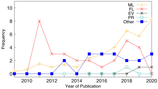 We then found the average of the frequencies for the ML techniques (ML). Other soft-computing methods include fuzzy logic (FL), evolutionary models (EV), and probabilistic reasoning (PR), and the techniques that did not fall within these categories were grouped into a class called “Other.” Figure 4 shows the trend line of the soft computing techniques (ML, FL, EV, PR, Other), the year of publication of all the studies, and their respective R2 values (0.8384, 0.0005, 0.0734, 0.0935, and 0.6157). The results showed that 83.8% of the ML data fit the regression model, and the trend line showed an increase in the usage of ML techniques and their application in the prediction and prognosis of tropical diseases. 0.05% of FL data fit the regression model, and those non-soft computing techniques are categorized as ‘Other’. Of the data, 61.57% fit the regression model, implying that non-soft computing techniques are also applied in the prediction and prognosis of tropical diseases. Lastly, 7.34% of EV data and 9.35% of PR data fit the regression model, indicating that these two techniques are seldom used in this research area.