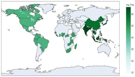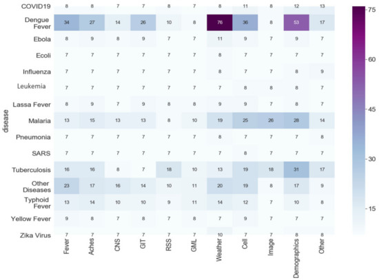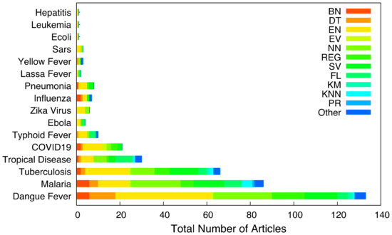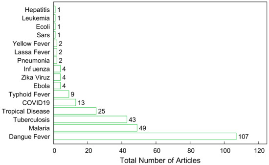 Figure 5 shows the total number of diseases covered. As shown, dengue fever, with 107 studies, is the most studied disease among all tropical conditions. Malaria and tuberculosis are also the second and third most frequently studied diseases, with frequencies of 49 and 43, respectively. According to Rupali [12], malaria and tuberculosis are significant infections in the tropics, and the varying rainfall patterns and upsurge in temperatures have resulted in creating a suitable environment for vector-borne diseases, specifically, dengue and malaria.