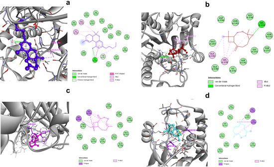 Visualization of interactions between various C. sativa compounds and human arginase. Interaction of delta-9-THC (a), CBD (b), caryophyllene oxide (c), and beta-caryophyllene (d) with the h-Arg protein and its linked amino acid residues.