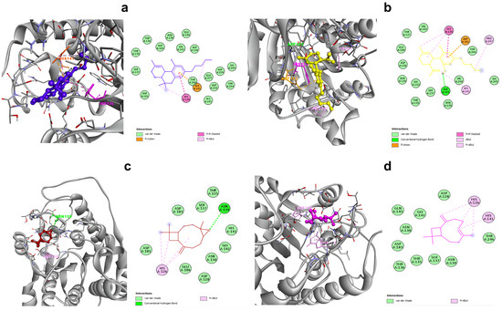 The docking results are presented in Table 2. Among the tested ligands, while interacting with LmArg, the delta-9-THC, caryophyllene oxide, beta-caryophyllene, and α-humulene showed the best binding scores of −6.02, −5.88, −5.79, and −5.55 kcal/mol, respectively. Although limonene had a score of −4.49 kcal/mol, the lowest ligand–protein affinity was in fact assigned to Glucantime® at −4.30 kcal/mol. These results were correlated with inhibition constants ranging between 38.63 µM for delta-9-THC and 702.95 µM for Glucantime®. Delta-9-THC has established conventional hydrogen bonds with HIS 154 and hydrophobic interactions with HIS 139 and ALA 140. The pi–donor hydrogen-bond interaction was also observed for TRH 257. There were also 14 amino acids (HIS 114, ASP 141, ASN 143, ASN 152, GLY 155, ALA 192, VAL 193, ASP 194, GLU 197, ASP 243, ASP 245, THR 255, GLU 256, and GLU 288) involved in weak van der Walls interactions (Figure 1a). On the other hand, caryophyllene oxide fit in the active site of LmArg and interacted with HIS 154 via conventional hydrogen bonds and with two other amino acids (HIS 139 and ALA 192) via hydrophobic interactions. Moreover, ALA 140, ASP 141, ILE 142, ASN 143, SER 150, ASN 152, GLY 155, ASP 194, GLU 197, and THR 257 were associated with target protein via the van der Waals forces (Figure 1b). Beta-caryophyllene formed pi–sigma interactions with HIS 139 and HIS 154, as well as van der Waals interactions with other residues (ALA 140, ASP 141, ASN 143, SER 150, GLY 155, ALA 192, VAL 193, ASP 194, GLU 197, ASP 243, ASP 245, and THR 257), as shown in the 2D interactions plot (Figure 1c). Similarly, on the active site of parasite arginase, α-humulene showed hydrophobic interactions with the same amino acids as beta-caryophyllene. Furthermore, van der Waals forces were observed for ASP 141, ASN 143, SER 150, GLY 155, ALA 192, ASP 194, GLU 197, ASP 243, ASP 245, and THR 257 (Figure 1d).