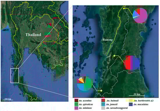 - Tainchum, K.; Kongmee, M.; Manguin, S.; Bangs, M.J.; Chareonviriyaphap, T. Anopheles species diversity and distribution of the malaria vectors of Thailand. Trends Parasitol. 2015, 31, 109–119. [Google Scholar] [CrossRef]
