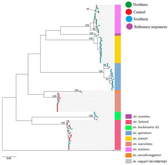 - Bunmee, K.; Thaenkham, U.; Saralamba, N.; Ponlawat, A.; Zhong, D.; Cui, L.; Sattabongkot, J.; Sriwichai, P. Population genetic structure of the malaria vector Anopheles minimus in Thailand based on mitochondrial DNA markers. Parasit. Vectors 2021, 14, 496. [Google Scholar] [CrossRef] [PubMed]