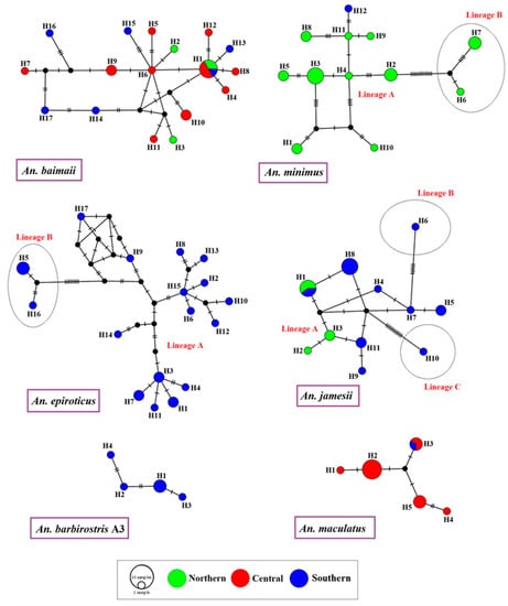 - Chen, B.; Pedro, P.M.; Harbach, R.E.; Somboon, P.; Walton, C.; Butlin, R.K. Mitochondrial DNA variation in the malaria vector Anopheles minimus across China, Thailand and Vietnam: Evolutionary hypothesis, population structure and population history. Heredity 2011, 106, 241–252. [Google Scholar] [CrossRef]
