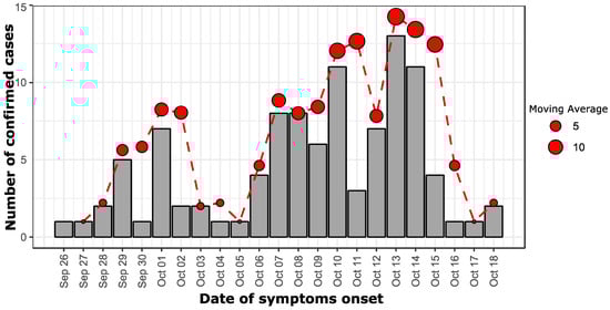 An epidemiological curve showing the number of confirmed dengue cases during this outbreak investigation according to the date of symptoms onset; a dashed red curve shows the moving average of confirmed dengue cases per 2 days. The size of the dot is proportional to the value of the moving average.