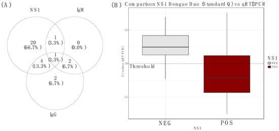 (A) Venn diagram showing repartition of Standard Q NS1/IgM/IgG positive test results from the field; the number of samples positives DENV according to the targeted analyte (NS1,IgM and IgG), (B) Box plot showing a comparison of the median Ct values of Standard Q DENV NS1/IgM/IgG RDT on NS1-positive and NS1-negative samples.