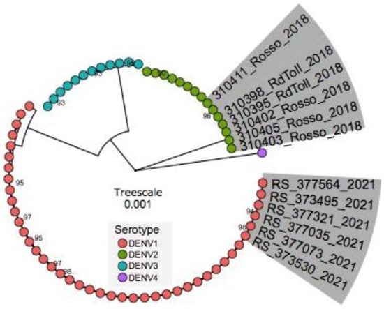 Maximum Likelihood tree showing the relationship and genetic diversity of Senegalese DENV-1 strains detected during this study. Sequences in this study and publicly available sequences belonging to described DENV serotypes were used. Tips are colored according to the serotype. Sequences of Rosso 2021 (this study) and those from a previous outbreak in 2018 are highlighted in grey. The tree was built using complete genomes. Only the names of Rosso sequences (RS) (2018 and 2021) are represented; the designation of all used sequences is depicted in Figure S1 (supplementary files).