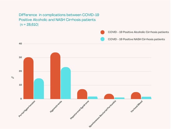 Difference in complications between COVID-19 positive alcoholic and NASH Cirrhosis patients.