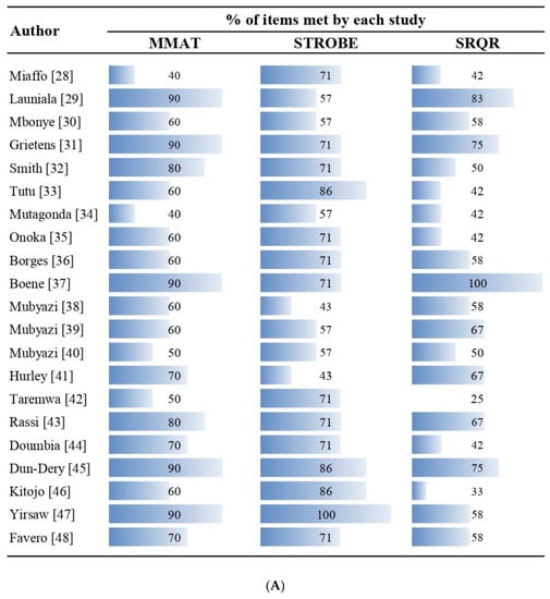 Ten studies met 70% or more of the MMAT criteria, in the qualitative component only four studies were above this value in the items of the SRQR guide (Figure 2A). The criteria least applied were “adheres to the quality criteria of the methods involved” of the MMAT; bias controls and description of the type of study in STROBE; while in SRQR were the indication of the research paradigm, characteristics of the research and guarantees of reflexivity, type of study, and techniques to enhance trustworthiness and credibility of the data (Figure 2B).