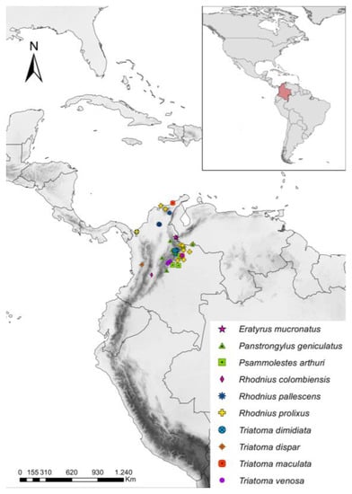 The Triatominae are classified into 5 tribes and 15 genera [6], but three are mainly related to transmission to humans: Triatoma (Laporte, 1832), Rhodnius (Stål, 1859) and Panstrongylus (Berg, 1879) [6]. The parasite triatomine feces transmit the parasite, which contains the infective forms of T. cruzi (metacyclic trypomastigotes), when they feed on the mammalian host and defecate later [2]. In Colombia, 26 triatomine species have been reported, but only 16 are considered to be naturally infected with T. cruzi [7,8]. Rhodnius prolixus (Stål, 1859) and Triatoma dimidiata (Latreille, 1811) are the main species and primary vectors transmitting the parasite [7,9]. However, in recent years, some species considered secondary vectors (Panstrongylus geniculatus (Latreille, 1811), Triatoma maculata (Erichson, 1848), Rhodnius pallescens (Barber, 1932), and Triatoma venosa (Stål, 1872)) were found to feed on human blood and be infected with sylvatic DTUs [10,11].