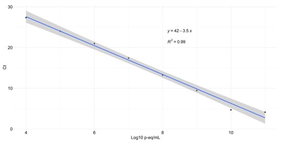 The curve was made using a TcI strain of T. cruzi and diluted with non-infected intestinal content of R. prolixus specimens in duplicate. The average values of the equation parameters showed an R2 value of 0.990, an efficiency of 91.4%, a slope of −3.546, a Y-intercept of 41.753, and a regression error of 0.926 (Figure 2). The Probit analysis showed a LOD value of 3.05 p-eq/mL (CI 95%; −7.02–13.13).