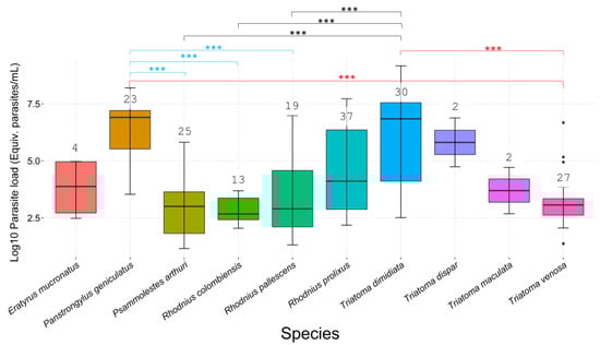 Boxplot of parasitic loads per species. Y-axis was transformed to Log10 scale for better visualization of the data. The number above the boxes is the number of samples per species. Asterisks (***) represent statistically significant comparisons (p < 0.0001). In blue, P. geniculatus with Ps. arthuri, R. colombiensis, and R. pallescens; in black, T. dimidiata with Ps. arthuri, R. colombiensis, and R. pallescens; and in red, T. venosa with P. geniculatus and T. dimidiata.