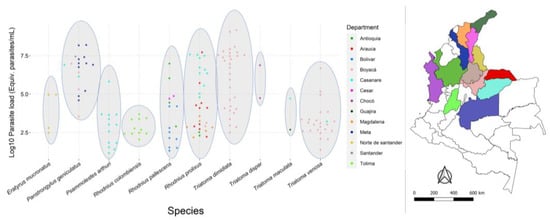 Of the 182 triatomines evaluated, 82.4% (150/182) were positive for T. cruzi infection, and the rates per species were the following: E. mucronatus (4/4; 100%), P. geniculatus (18/23; 78%), Ps. arthuri (13/25; 52%), R. colombiensis (11/13; 85%), R. pallescens (15/19; 79%), R. prolixus (31/37; 84%), T. dimidiata (30/30; 100%), T. dispar (2/2; 100%), T. maculata (2/2; 100%), and T. venosa (24/27; 89%) (Figure S1). For the positive samples, P. geniculatus, R. prolixus, and T. dimidiata were the species with the highest loads of T. cruzi (Figure 3), and P. geniculatus, R. pallescens, and R. prolixus were the only species collected in more than two departments (Figure 4, Figure S2). For better visualization of the data, the parasite loads were transformed to Log10 values, with 1 being an order of 10, 2 of 100, 3 of 1000, 4 of 1 × 104, 5 of 1 × 105, 6 of 1 × 106, 7 of 1 × 107, and 8 of 1 × 108.
