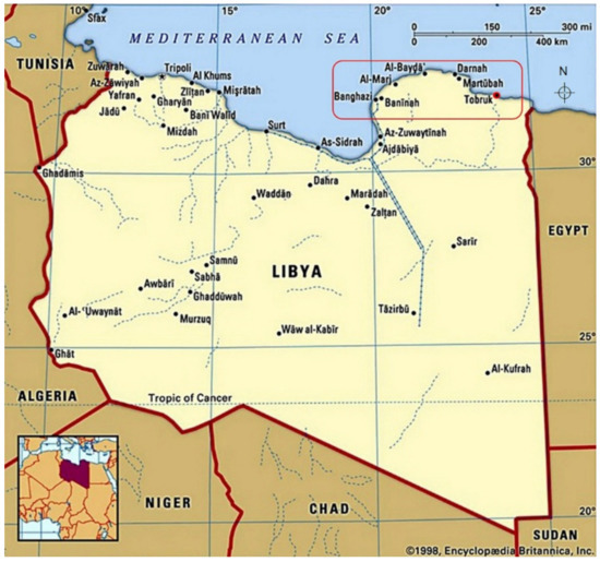 A map shows the location of Tobruk city and the neighboring cities (within the red blank). Reprinted with permission from ref. [9]. Copyright 2022, Encyclopædia Britannica.