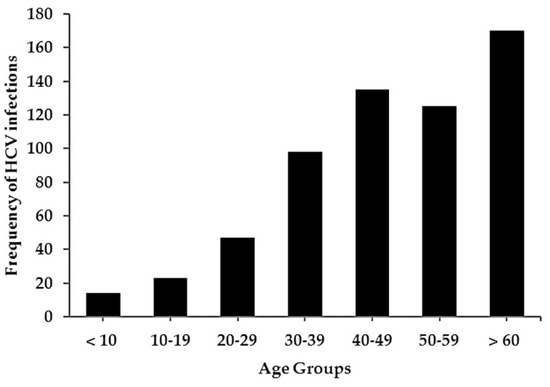 Anti-HCV antibodies were found to be present at a slightly higher frequency in females (54.1%) than in males. This percentage was consistent with that reported by other studies on this topic [11,12,13]. A gradual increase in anti-HCV positivity was observed in the older age groups (over 30 years). The overall HCV antibody-positive rate steadily increased with age. This was consistent with the findings of some cross-sectional studies in China [14].