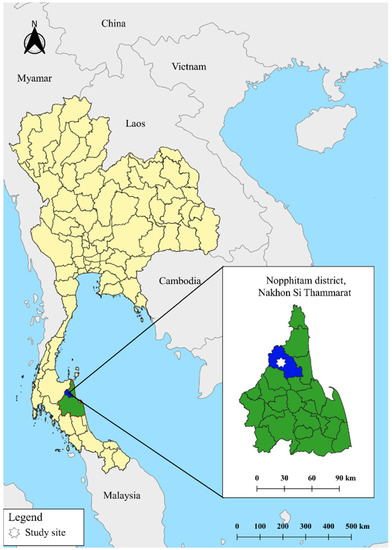 Location of the study site—Nopphitam District, Nakhon Si Thammarat Province, Thailand. Quantum GIS version 3.12 (ESRI base maps) was used to generate the map (https://qgis.org/en/site/ (accessed on 30 December 2021)).