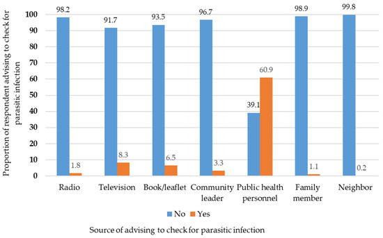 Proportion of respondents advised to check for parasitic diseases by source of advice.