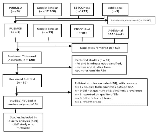 The database search resulted in 13,527 studies. Another 4 studies were further found in the RAAB database, bringing the total to 13,531. Following various screening processes, 10 studies were included in the meta-analysis and 9 in the quality analysis. One study was omitted from the quality analysis as it did not include a methodology section [21]. Most of the studies were from KwaZulu-Natal (50%) [25,26,27,28,29], while those from the Western Cape and North West were 10% each [21,30]. The remaining 30% of the studies were conducted in the province of Limpopo [31,32,33]. Two studies were conducted on low-vision patients and showed a high prevalence of oculocutaneous albinism (OCA) as a cause of URE and MSVI [26,29]. Other lesser causes of MSVI were macular degeneration, complications following cataract surgery, and “other” causes. The quality of all the included studies was above average, with reviewers individually scoring studies from 60% to 100% (Supplementary File S3) with an an overall average score of 71.11%. According to the independent reviewers, all the included studies were of relatively good quality. From the total sample of 13,525 participants, approximately 28% were males, with the remaining 72% being female.