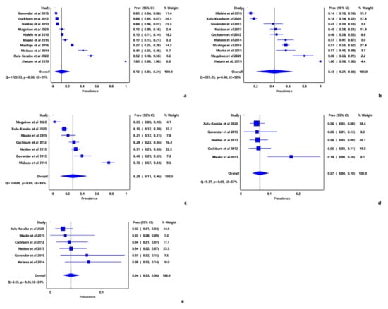 Forest plots of the prevalence estimates of MSVI and its major causes in South Africa; (a) Overall MSVI prevalence, (b) URE, (c) Cataract, (d) Glaucoma, (e) diabetic retinopathy.